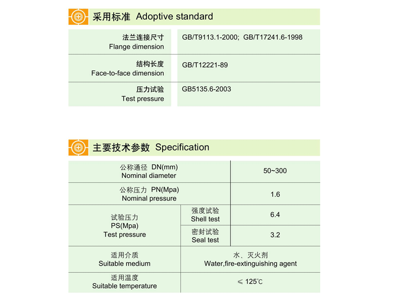 主要性能規范:公稱通經 公稱壓力 工作溫度 密封試驗 強度試驗 適用介質 DN50~400mm 1.0/1.6/2.5MPa -10℃~-80℃ 1.1倍公稱壓力 1.5倍公稱壓力 水、油、氣等。