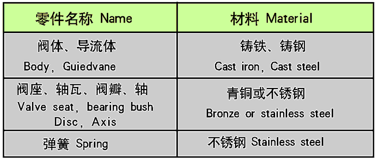 該閥由閥體、閥座、導流體、閥瓣.軸瓦及彈簧等零件組成。內部流道采用流線型設計,壓力損失