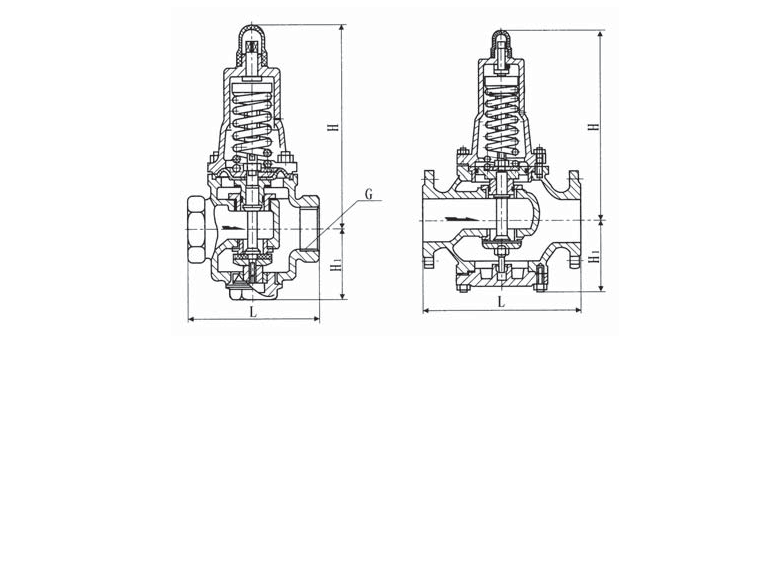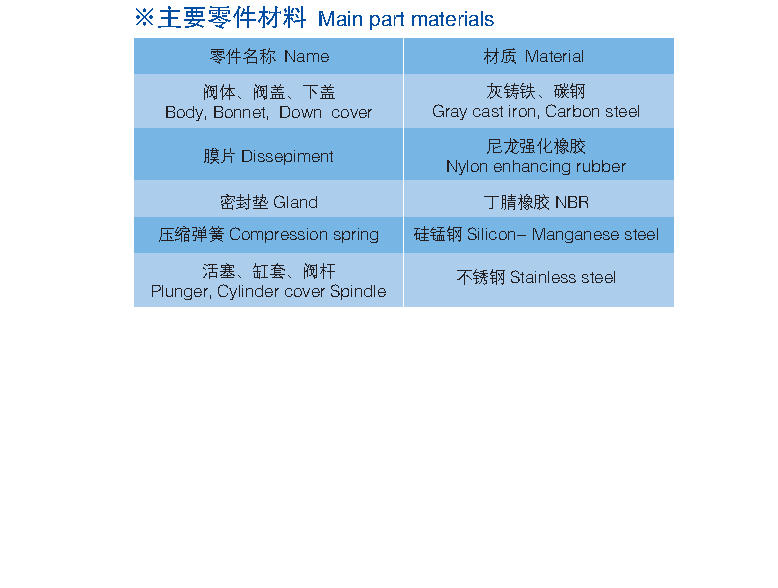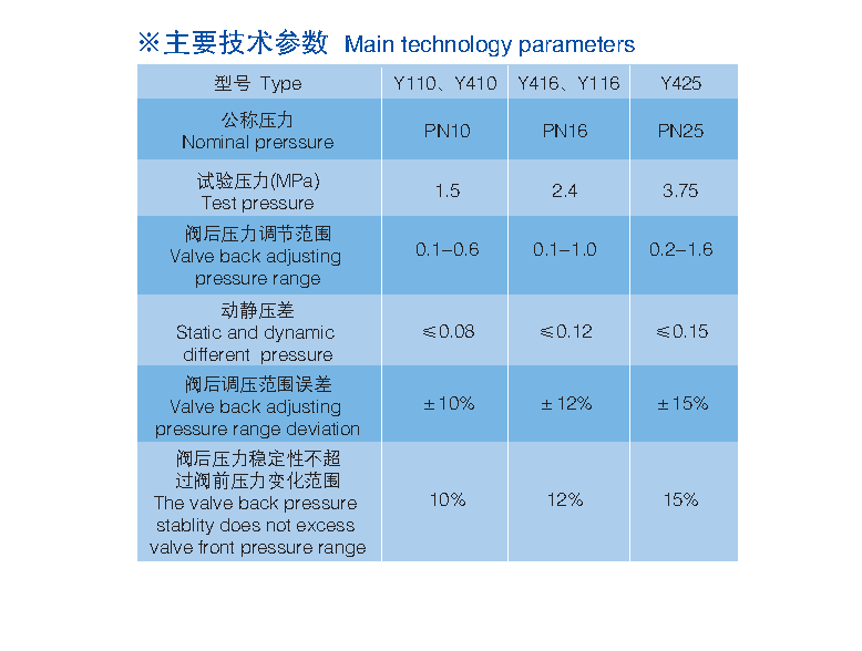 Y110、Y410、Y416,  Y425型減壓穩壓閥由閥體、閥蓋、壓縮彈簧、閥桿、活塞(膜片)、缸套、閥座及密封墊等零件組成。
