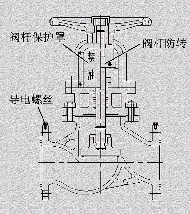 5. 閥桿保護裝置。外漏閥桿部分有保護罩,防止灰塵和油污。有“禁油”標志。